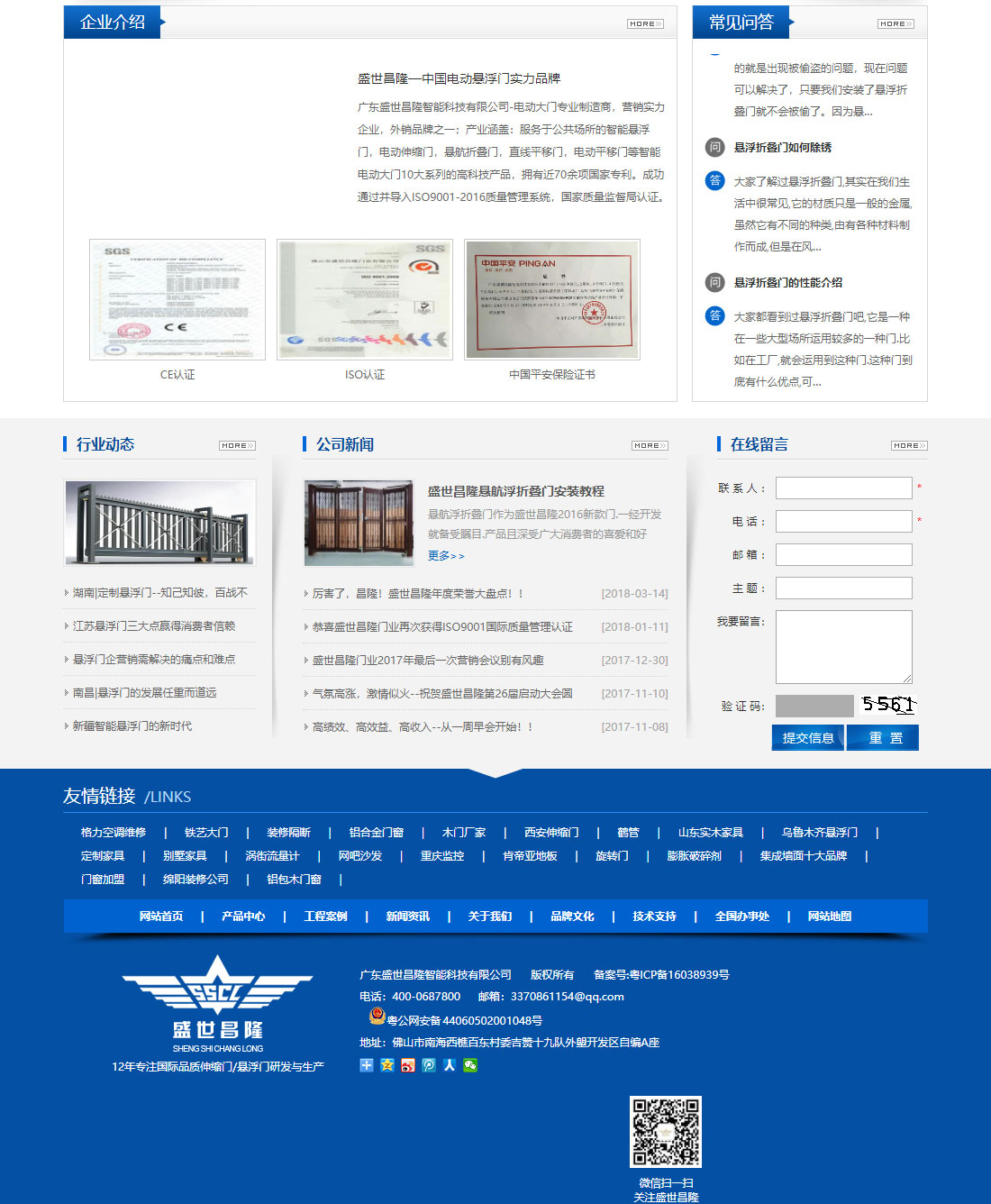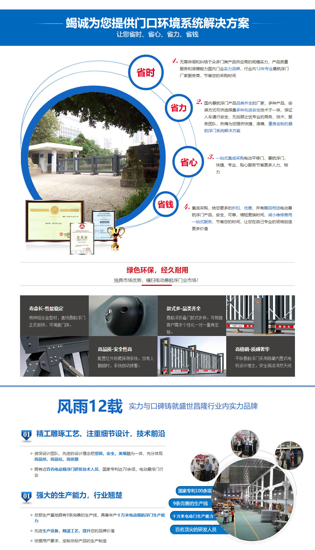 廣東盛世昌隆智能科技有限公司-電動大門專業制造商,營銷實力企業,外銷品牌之一;產業涵蓋:服務于公共場所的智能懸航門,電動伸縮門,懸航折疊門,直線平移門,懸掛門等智能電動大門10大系列的高科技產品,擁有近70余項國家專利。成功通過并導入ISO9001-2016質量管理系統,國家質量監督局認證。